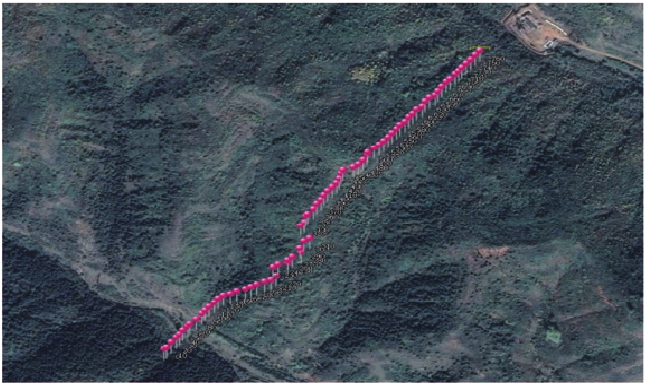 1)勘探深度大。地震频率谐振勘探技术勘探深度与应用的震源能量和检波器频率有关,如果应用0.05Hz检波器,适当加长采集时间,可以勘探到几千米。本次勘探通过30min的勘探时间可以获得2km深度的资料。2)探测效率高。地震频率谐振勘探方法本质是一种被动源地震勘探技术,与其他被动源勘探技术相比,减少了大量的采集时间。3)探测精度高。抗干扰能力强,本套技术中应用大能量信号源和多次叠加技术压制大量的无用信号噪声,提高有用信号的信噪比,并且在常规面波勘探中加入被动源信号,在常规频率谐振勘探中加入主动源信号,使得该方法本身具有很强的抗干扰能力,保证在强干扰的环境中,能够采集到地下真实信息。1)数据采集。本次实验工作设计剖面2条,点距10m。其中L1(南线)完成测点120个,长度1.19km。L2(北线)完成测点77个,长度0.76km。实际完成总测点数197个,剖面总长度1.95km。剖面测点实际位置见图3、图4。